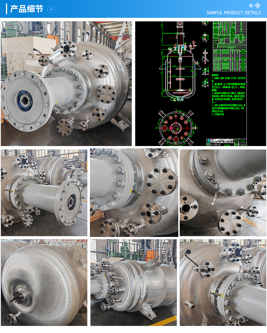 主要材料 釜體材料主要采用不銹鋼與碳鋼復(fù)合材質(zhì) S30408(304)+Q345R、S31603(316L) +Q345R、S32168(321)+Q345R, 也可是純不銹鋼材質(zhì),并可根據(jù)不同介質(zhì)要求制作鈦材、鎳材、鋯材、哈氏合金、蒙耐爾合金等復(fù)合材質(zhì)反應(yīng)釜,也可根據(jù)客戶要求主要材料噴涂四氟PTFE/PPL。